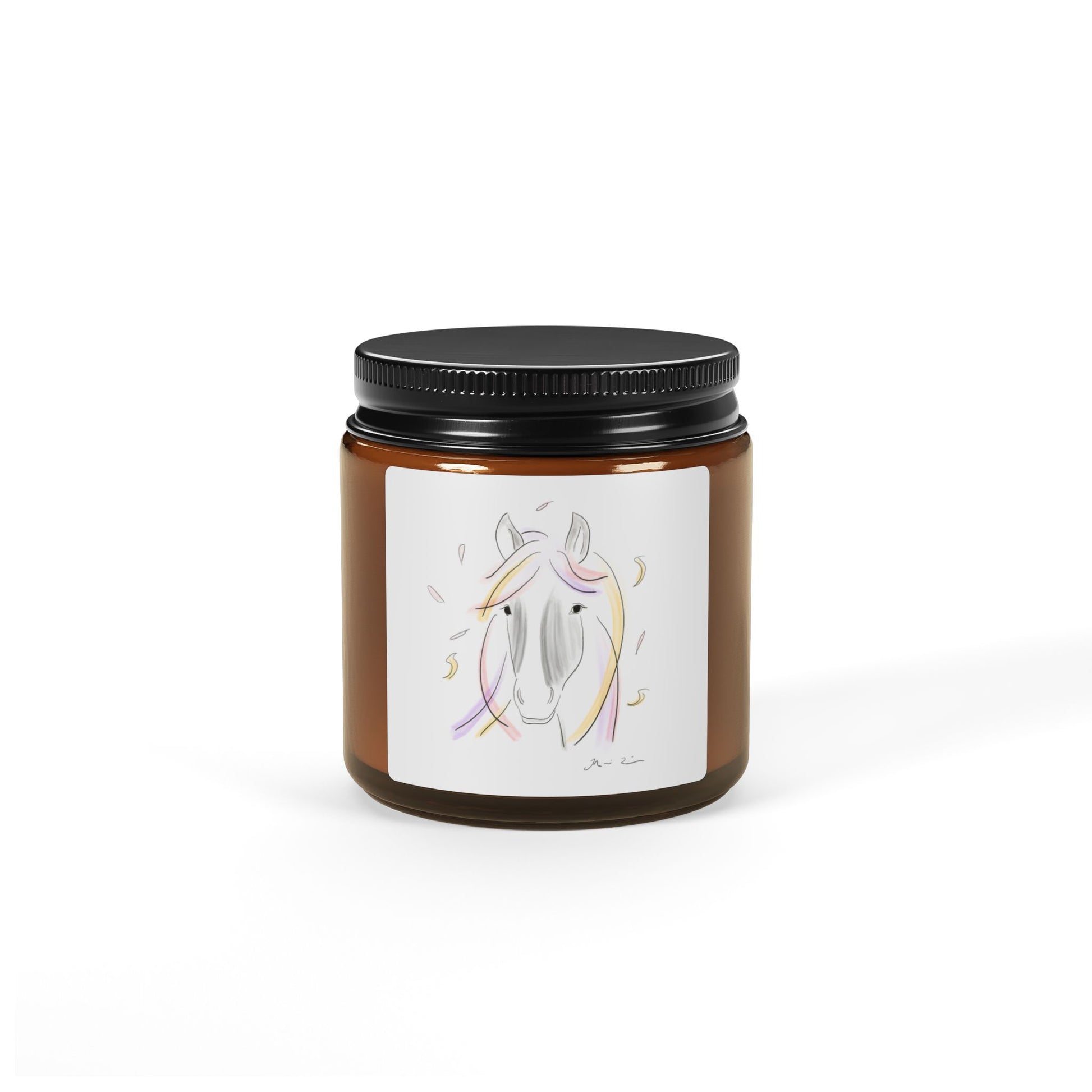 Eco-friendly scented soy candle with elegant horse artwork.